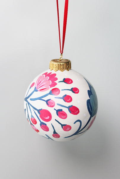A hand painted, one-of-a-kind 3" ceramic bisque ornament. Painted in acrylics with a semi-gloss sealer.