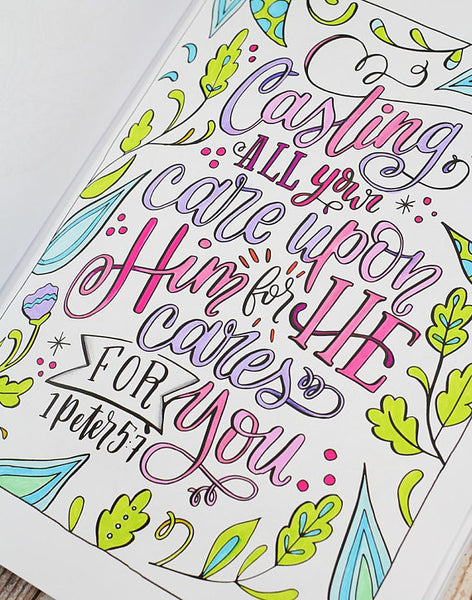 This 60 page book features 28 hand drawn floral illustrations and hand lettered bible verses and quotes.