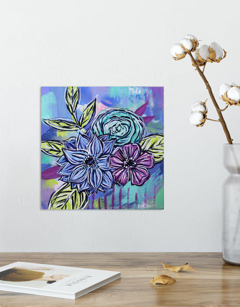 This piece is from my 2020 Fall Collection: Joyful Bouquets. One of fourteen paintings in the collection, Joyful Bouquet Seven somehow takes moody colors and turns them into a happy little party.