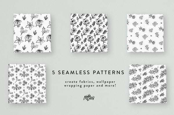 5 repeat patterns as AI swatches, JPEG files (5000 x 5000 pixels), and PNG files with transparent backgrounds (5000 x 5000 pixels)